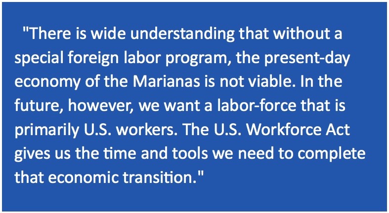 The Marianas economy will have access to foreign labor for 10 more years and new protections for U.S. workers and local businesses under terms of the Northern Mariana Islands U.S. Workforce Act. The President signed the Act on Tuesday evening. U.S. Public Law 115-218 provides 13,000 Marianas-only CW visas beginning in fiscal year 2019. That is an increase of 8,001 over the 4,999 set by the Trump administration, which would have been a disaster for our economy. P.L. 115-218 also continues the bar on claims of asylum in the Marianas, without which there would be no parole for Chinese tourists, who make up almost half of all arrivals.